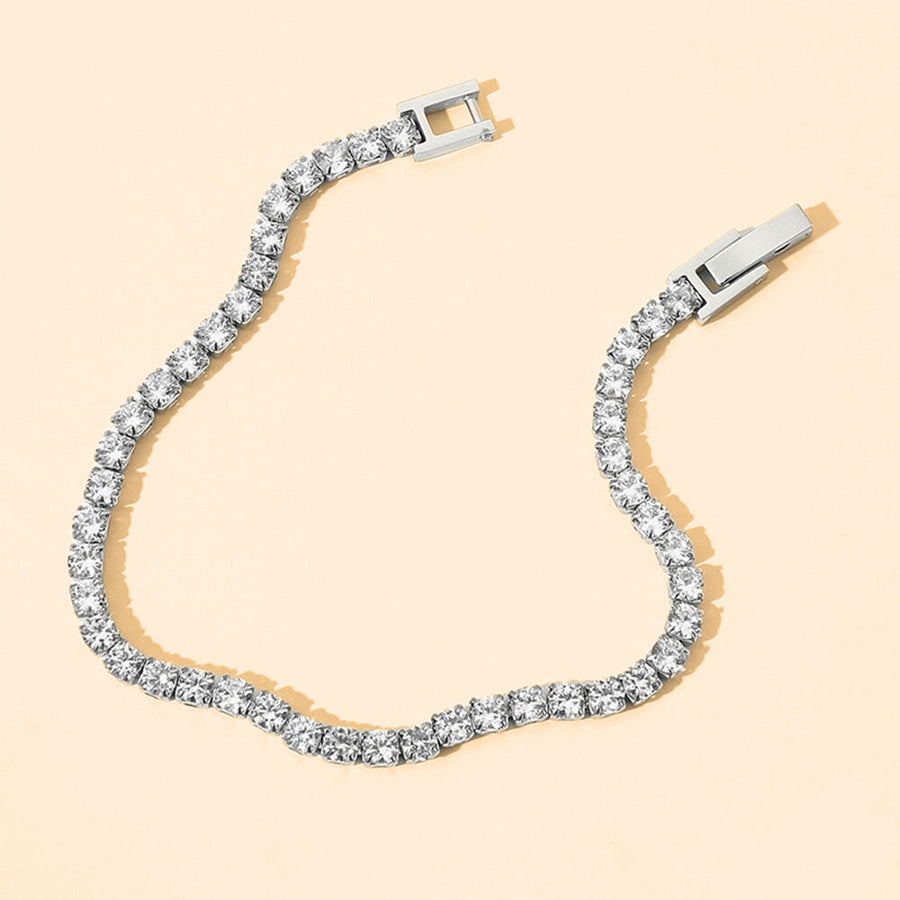Elevate your style with our silver Nina tennis bracelet. This exquisite band features stunning AAA zirconia stones graded with white PVD gold plating. Indulge in luxury with this sophisticated and exclusive piece that will add a touch of elegance to any ensemble.