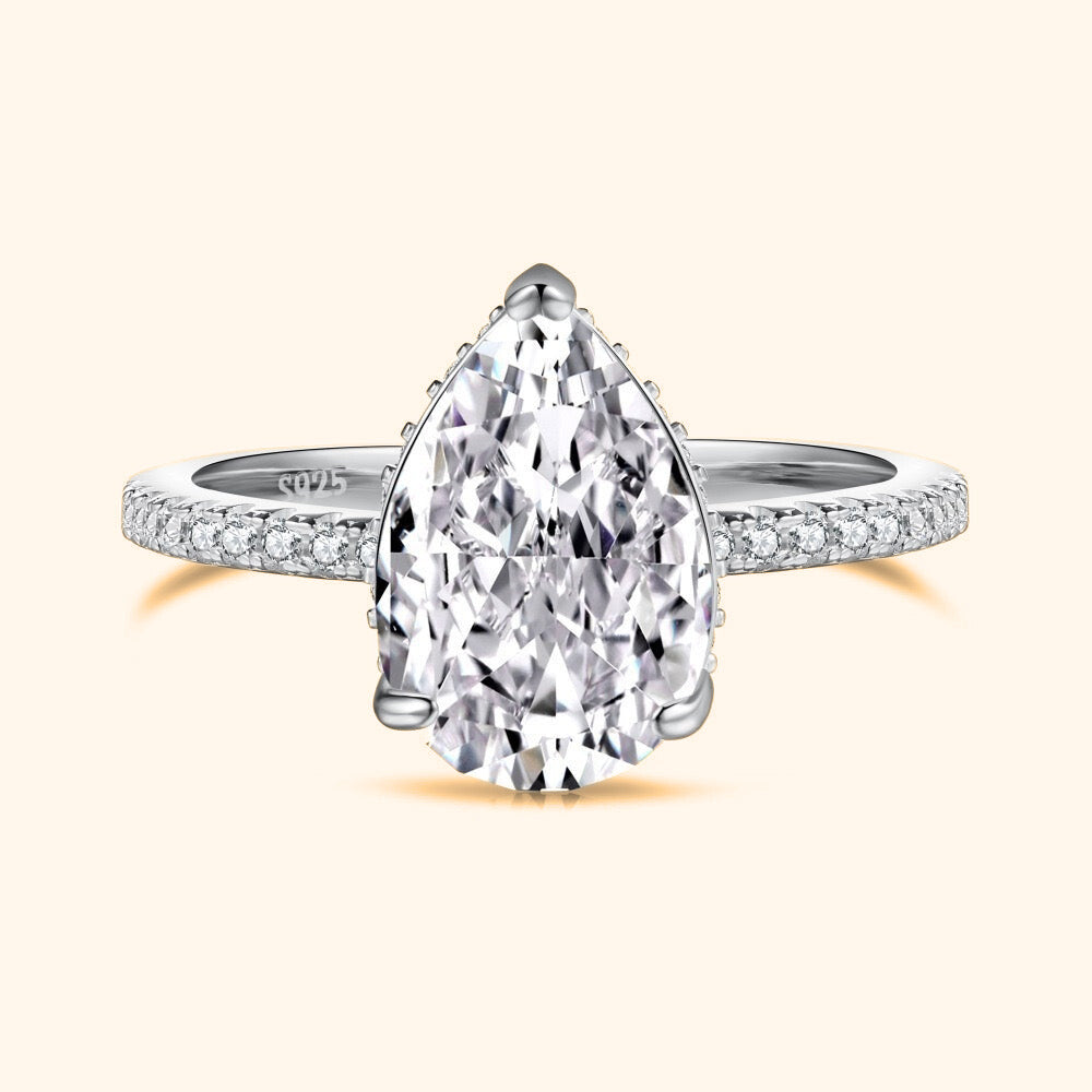 Indulge in elegance with the Sylvie ring, a stunning sterling silver piece adorned with mini zirconia stones. The centerpiece is a luxurious AAAAA zirconia stone in a sophisticated pear shape. Ideal as a promise ring or for travelling without your prized diamond. Pairs well with our Iris ring.